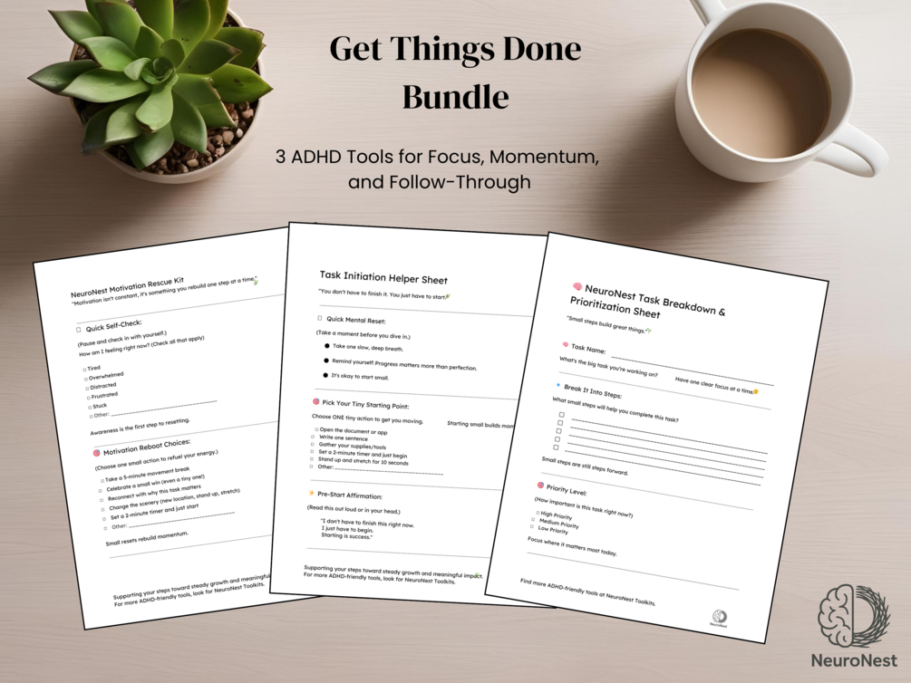 When you purchase the Get Things Done Bundle, you’ll receive: ✅ Task Breakdown & Prioritization Sheet – A guided sheet to help you break large, overwhelming tasks into clear, manageable action steps. ✅ Task Initiation Helper Sheet – A gentle reset page with tiny starting prompts and self-affirmations to help you finally begin. ✅ Motivation Rescue Kit – A printable tool designed to help you check in with your emotions, reset your energy, and regain momentum. ✅ Start Here Guide – A calming introduction to the bundle with suggestions for how to use each tool based on your current needs. All tools are printable, neurodivergent-friendly, and designed to support gentle, non-linear progress — without shame or overwhelm.