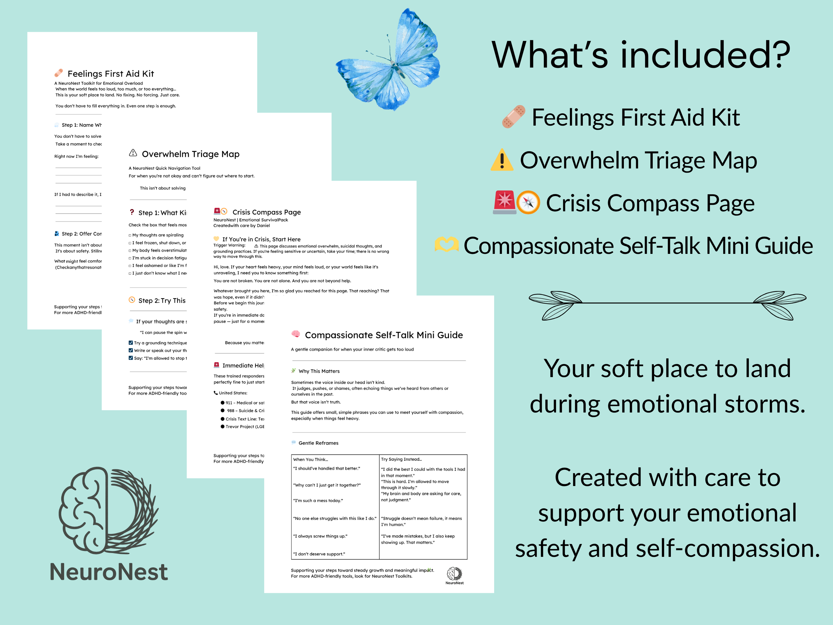 📦 What You’ll Get: 🩹 Feelings First Aid Kit — Name what you're feeling and discover what you need most right now ⚠️ Overwhelm Triage Map — Gently match your current state with small next steps that feel doable 🚨🧭 Crisis Compass Page — A 5-step calming flow with hotline resources and anchoring support 💛 Compassionate Self-Talk Mini Guide — Gentle reframes and printable bookmarks for inner kindness